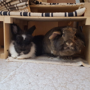 Nach einem bewegten Kaninchenleben mit einigen Partnerwechseln durfte ich wieder bei einem Kuschelfreund einziehen. Wir sind beide schon in etwas gesetzterem Alter und haben uns sehr bald gut miteinander vertragen. Mit Toby macht eine Entdeckungsreise durch die Wohnung richtig Spaß. Wir genießen es, aus einer Schüssel zu fressen, auch wenn zwei nebeneinander stehen. Von meinem Gefährten lerne ich auch, den Händen zu vertrauen, die uns streicheln. Und wenn er gestreichelt wird, renne ich sofort hin, um mir meinen Anteil an Liebkosungen zu holen. Es geht mir richtig gut hier! Haltet mir die Pfoten, dass ich dauerhaft bei meinem „Toby“ bleiben kann. (November 2018)